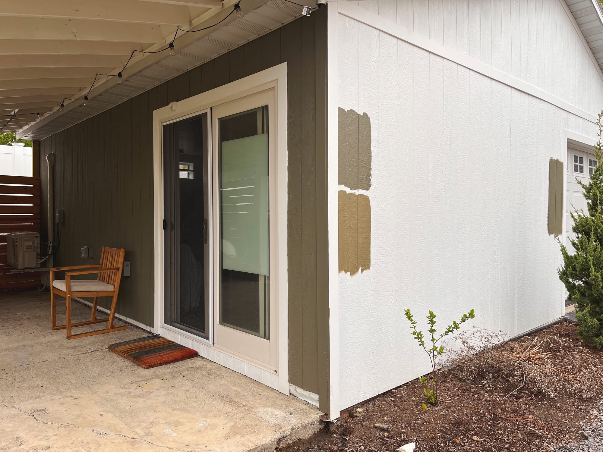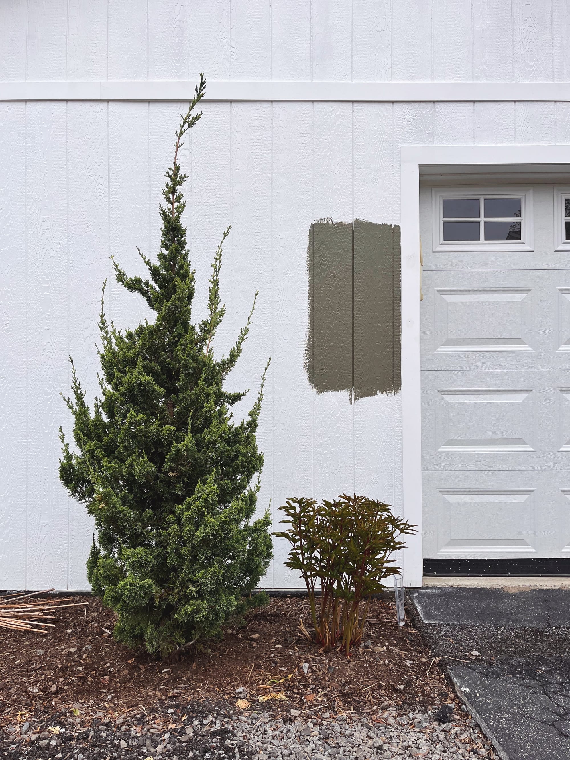 For the garage, we settled on a Benjamin Moore color called Gloucester Sage, a dark grey-green that will disappear nicely into the garden, hopefully. We’re feeling our way into it: It’s easy enough for us to paint the siding, but the other surfaces and details present all sorts of complications (being variously vinyl, aluminum, perforated, flexible, etc). I desperately want it to be all one color and call no attention to itself, but for now we’re painting the walls and will see if I can live with the white trim. If not, maybe next year we’ll be able to hire help doing all the more tedious bits. If I do find the white trim annoyingly loud in the near term (which I will), it will still be a vast improvement not to have this glare-y white box in the scene. Even partially painted, it already looks so much better.