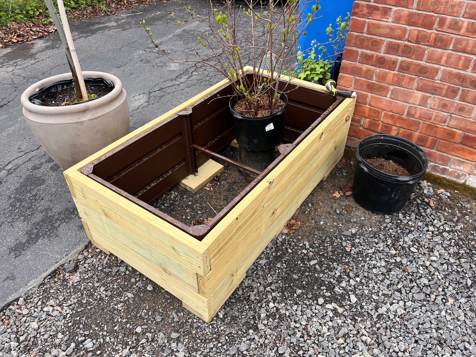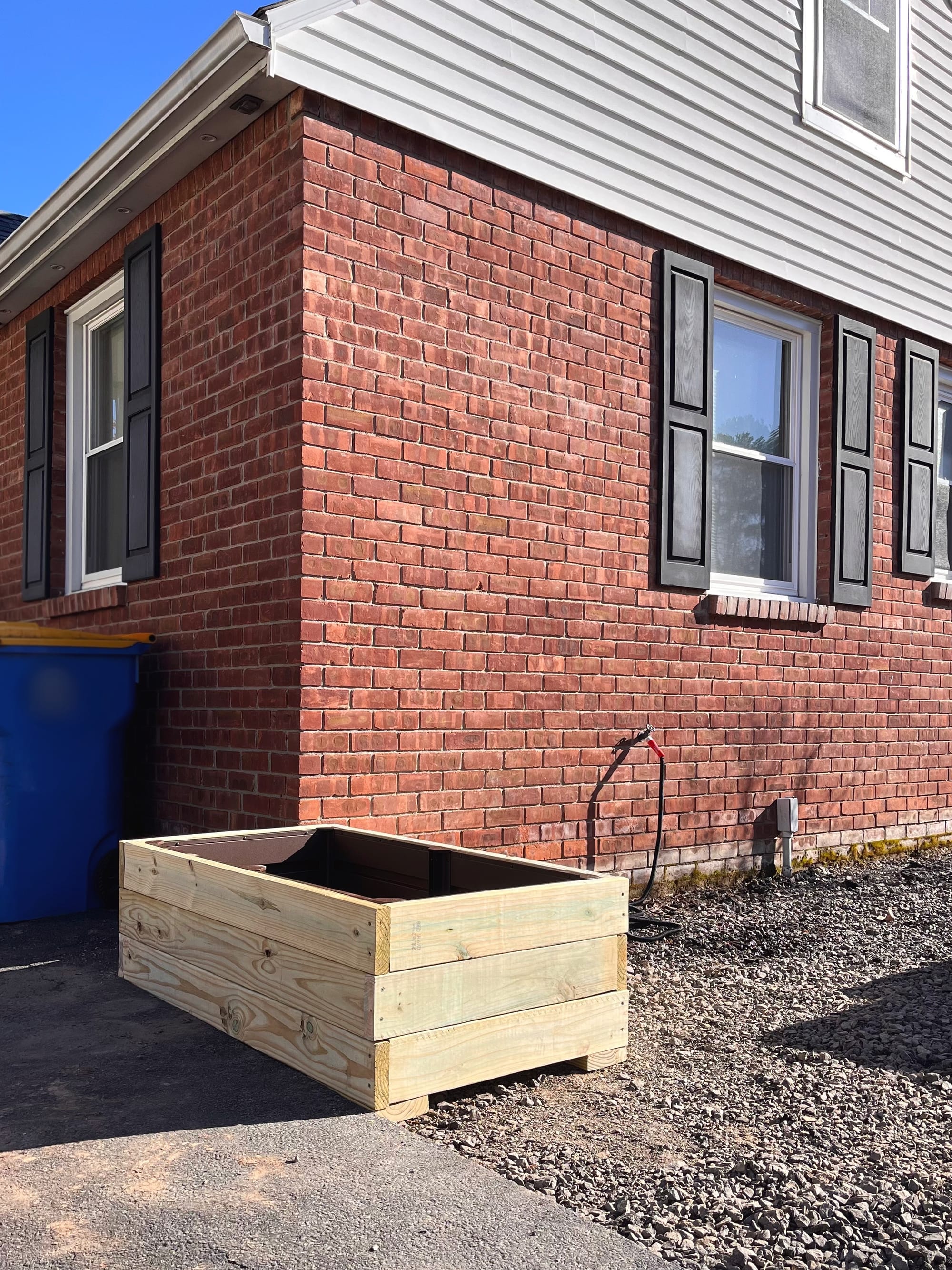 I deliberated quite a bit about the size and nature of this planter box for the back corner of the house, which is meant to separate the driveway (and trash bin area) from the garden and will provide some lush, green screening once planted. In a fantasy scenario where I could have anything I wanted, I’d have had a cor-ten steel planter made to the exact right size, which would have blended nicely with the brick. Unfortunately, I am on a budget. So then what?